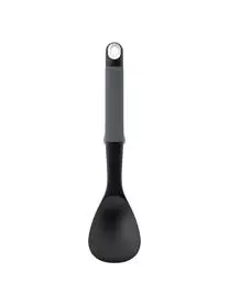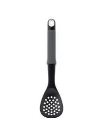 Das siebenteilige Set besteht aus je einer Zange, Pfannenwender, Schaumlöffel, Schöpfkelle, Kochlöffel, gelochten Pfannenwender und Ständer mit einer rutschfesten Unterseite.