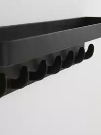 Hakenleiste aus Eisen mit acht Haken und einer praktischen Ablage. Diese hat eine kleine umlaufende Kante, sodass Schlüssel, Handys und andere kleine Gegenstände an ihrem Platz bleiben. Die Hakenleiste ist durchgehend schwarz lackiert.
