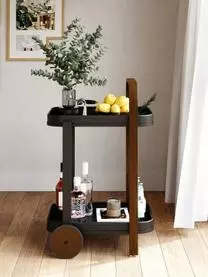 Der Bellwood Bar- und Servierwagen ist ein moderner, zweifarbiger Holzwagen, der jede Ecke Ihres Zuhauses perfekt ergänzt. Stellen Sie sich Ihre eigene Bar zusammen oder verwenden Sie Bellwood als Gartenwagen oder Beistelltisch für drinnen. Dank der gummibereiften Räder lässt sich Bellwood leicht bewegen. Das Tablett lässt sich zudem abnehmen. Die zwei Etagen bieten viel Platz für Ihre Barutensilien, Stielgläser, Dekoration und vieles mehr.